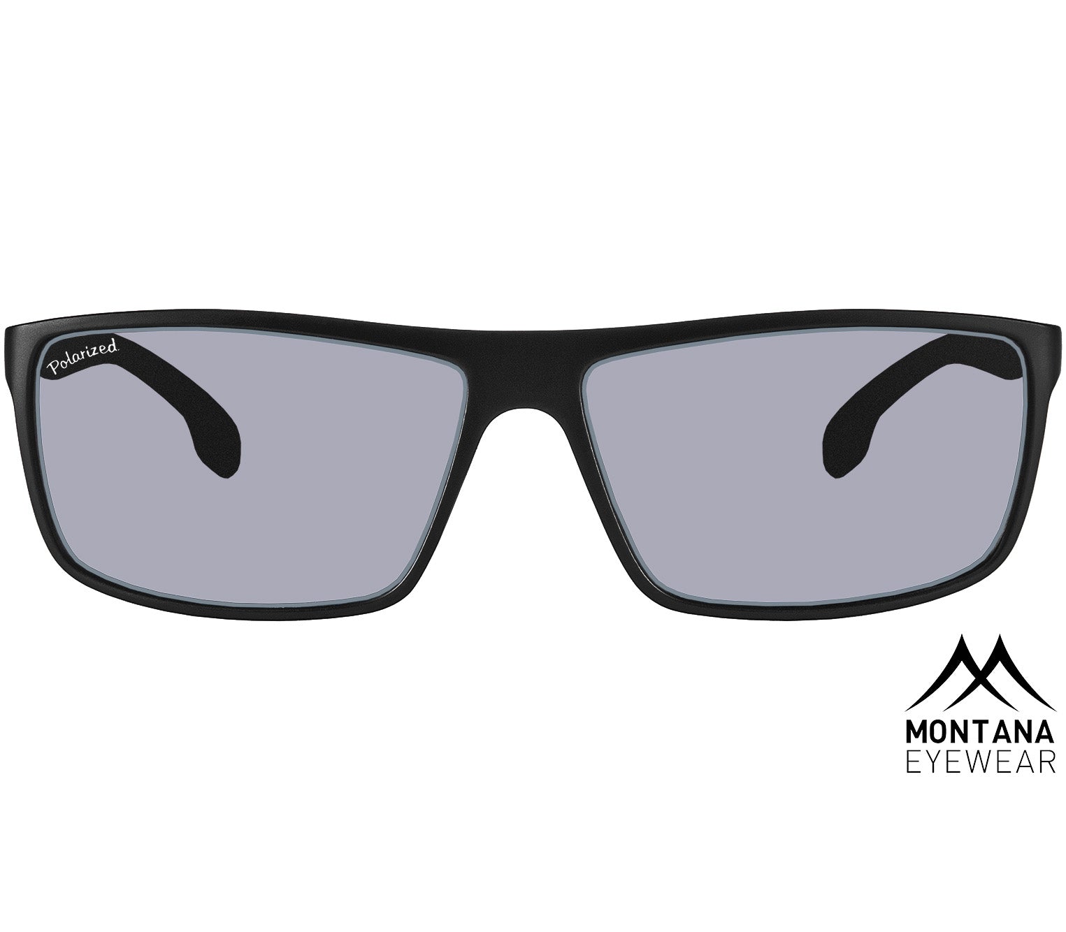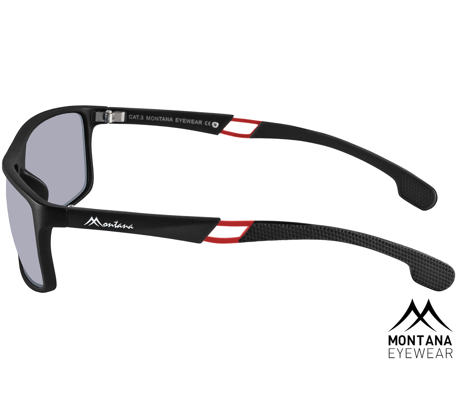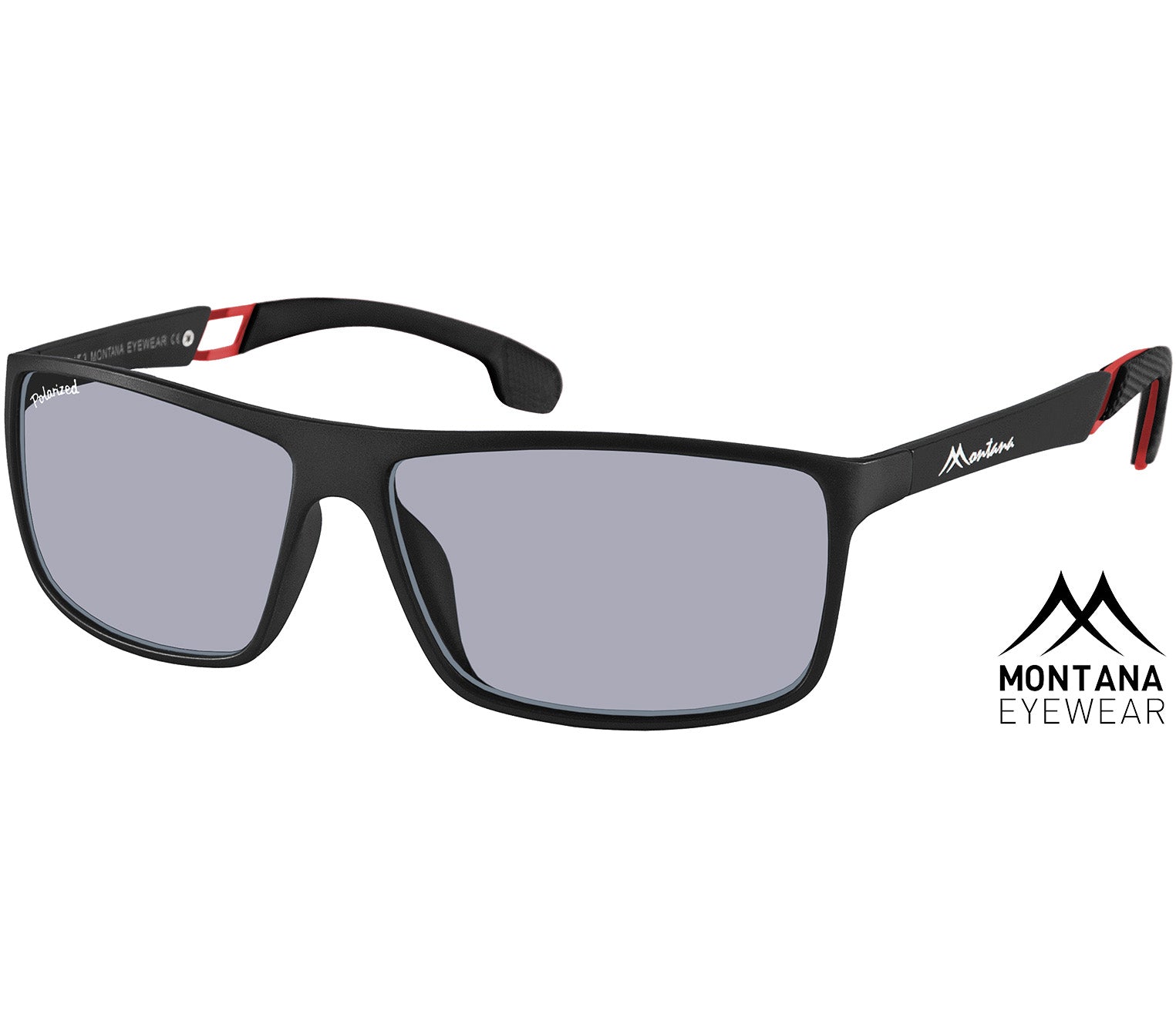 Sports sunglasses from popular Swiss-designed brand Montana Eyewear. These glasses feature a wrap around matt black frame with contrasting red metal detailing and rubberised temple tips for a secure fit. The smoke grey lenses provide UV400 category 3 sun protection, suitable for strong sunlight, as well as being polarised which reduces glare. A matching drawstring soft pouch is also included.