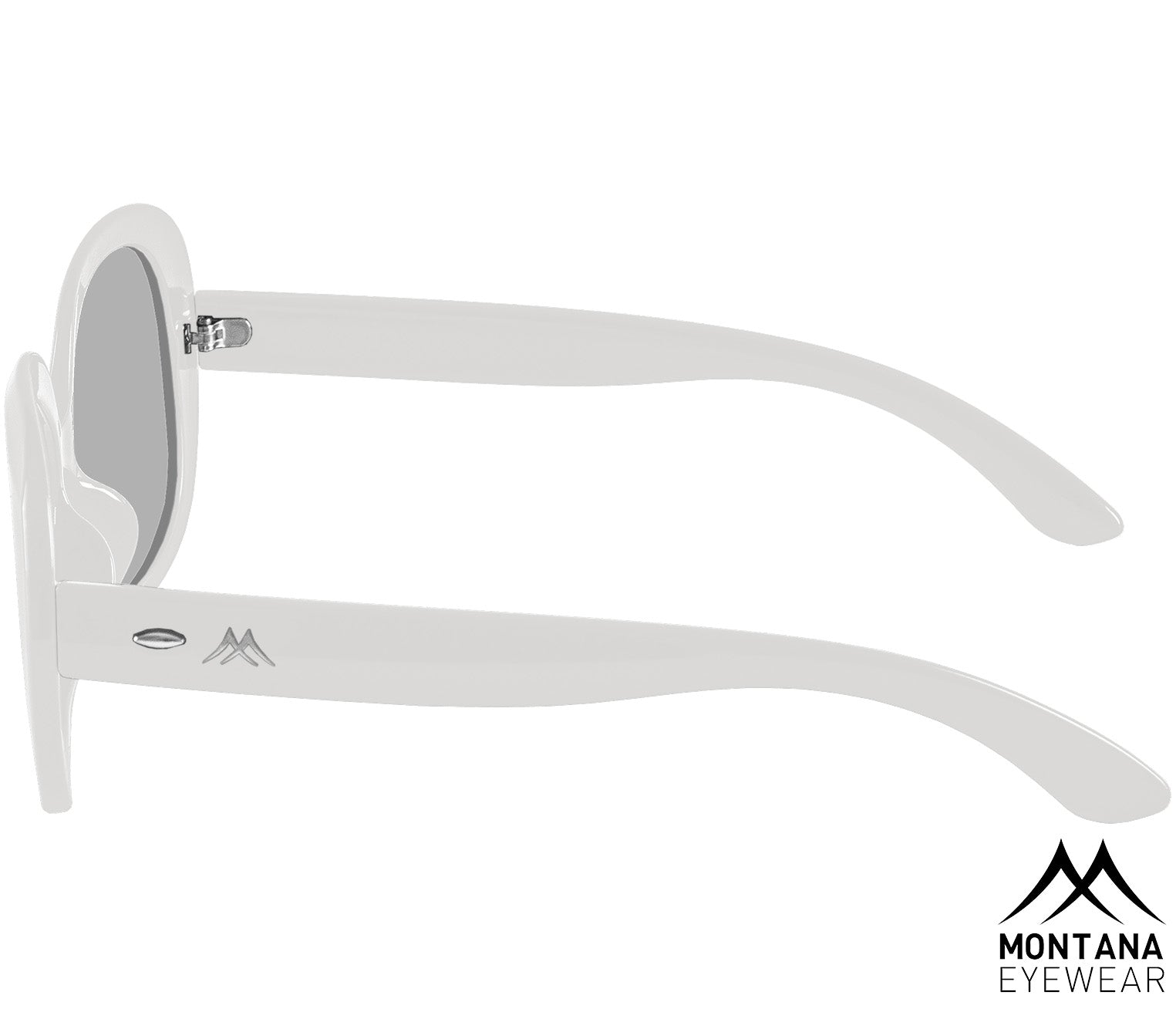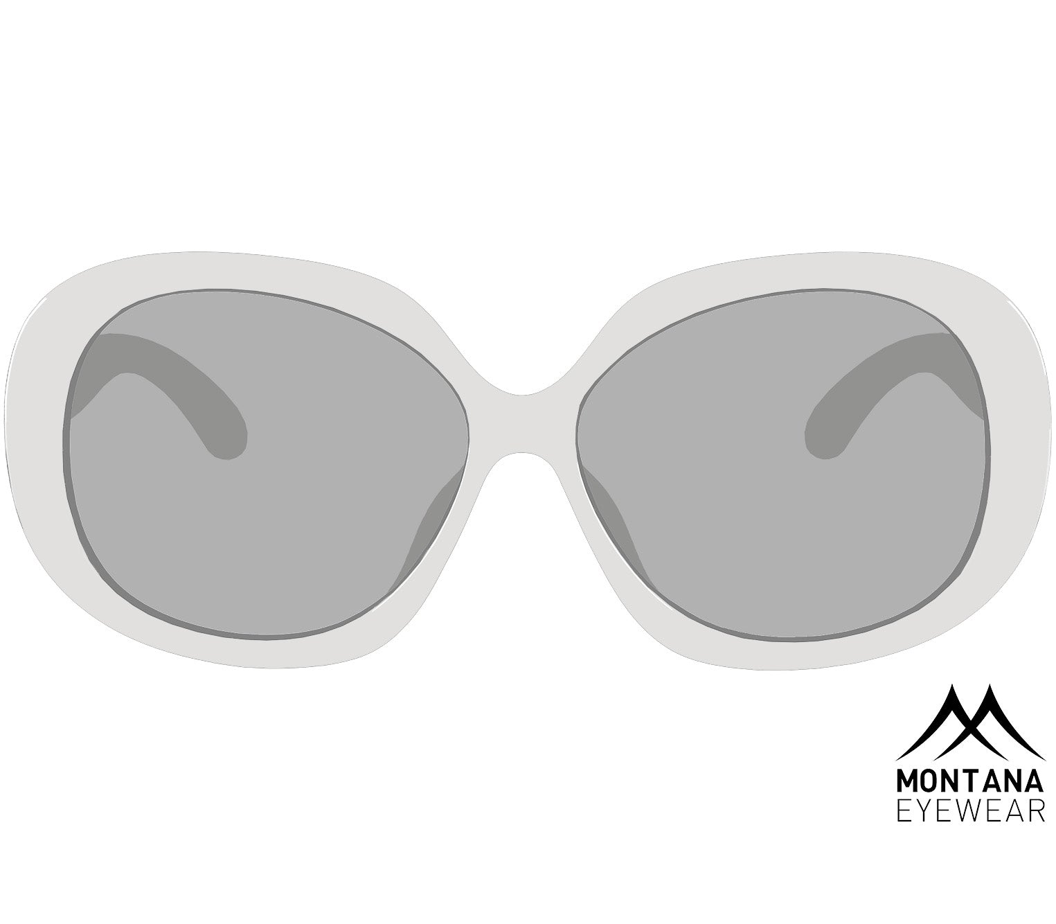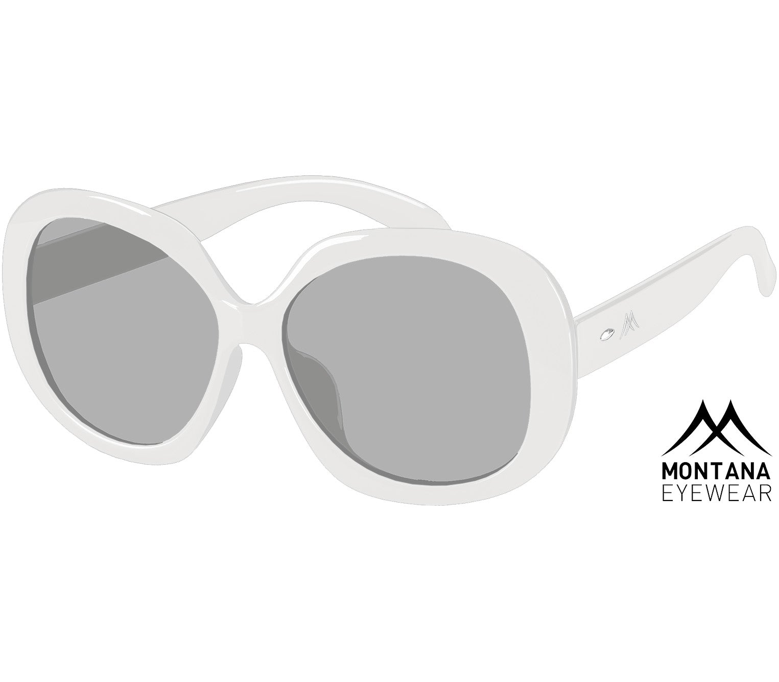 Elegant ladies sunglasses created by the Swiss-designed Montana Eyewear brand. These oversized sunglasses feature a chunky oval frame shape and a glossy white finish. The grey tinted lenses provide category 3 UV400 sun protection, suitable for strong sunlight, while also being polarised so reducing glare. A matching Montana branded drawstring pouch is also included.