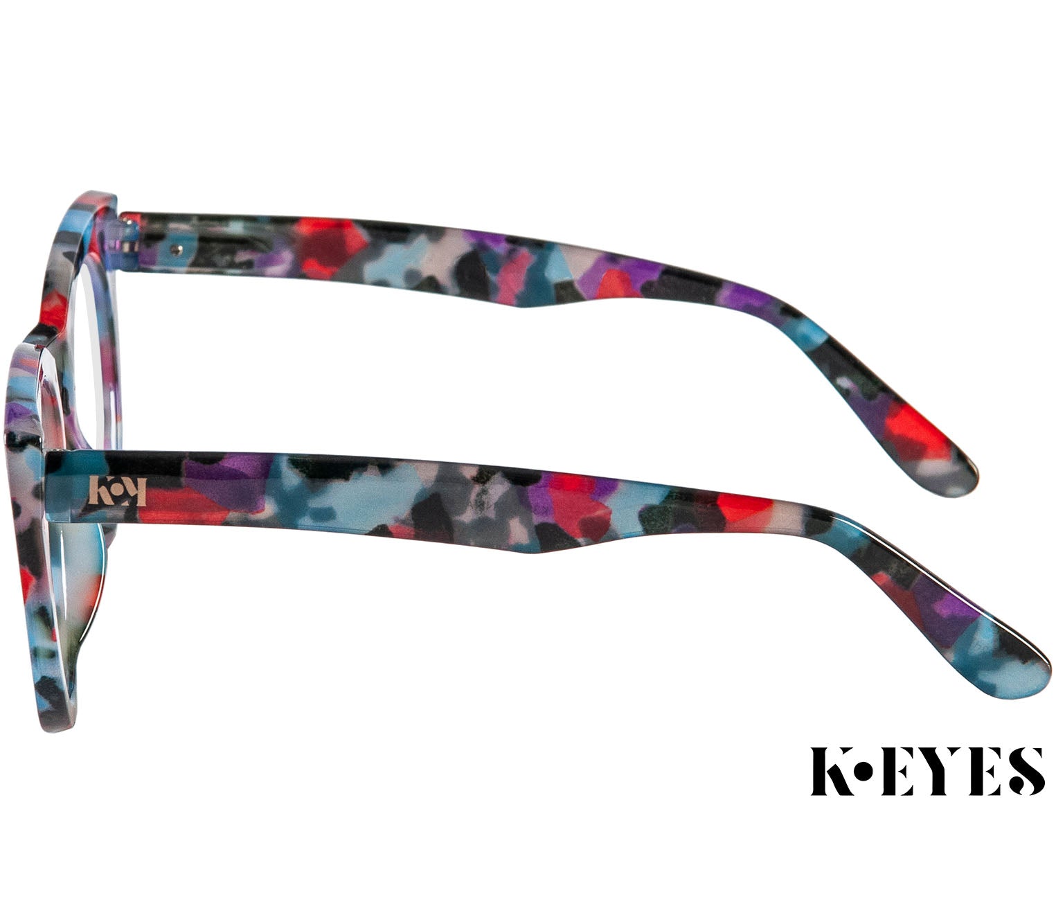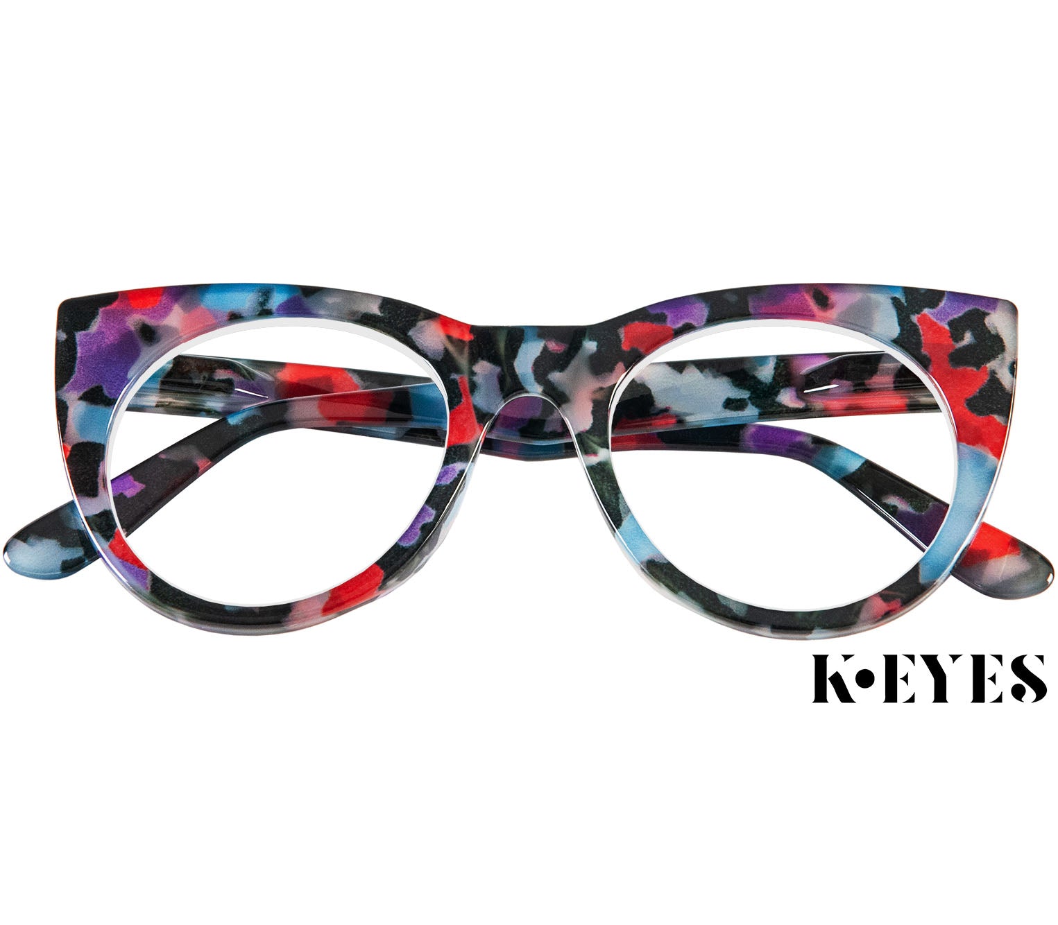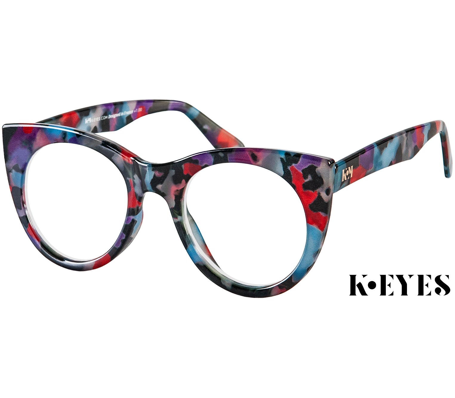 Oversized cat eye reading glasses from exceptional French designer brand K-Eyes. Featuring large round lenses and a bold multi-coloured patterned frame with a glossy finish. Spring hinges ensure optimum fit and comfort and scratch resistant lenses provide added durability. A matching soft grey zipper pouch is also included.