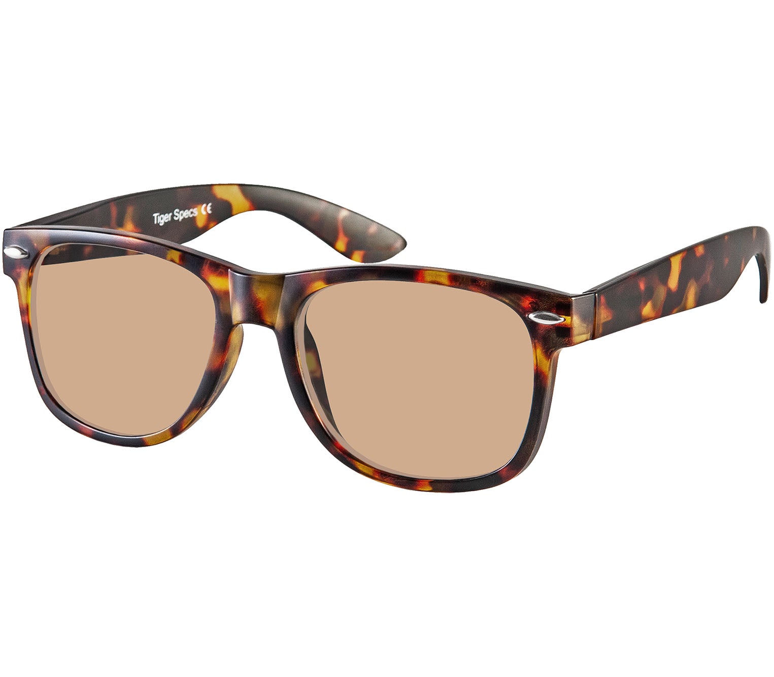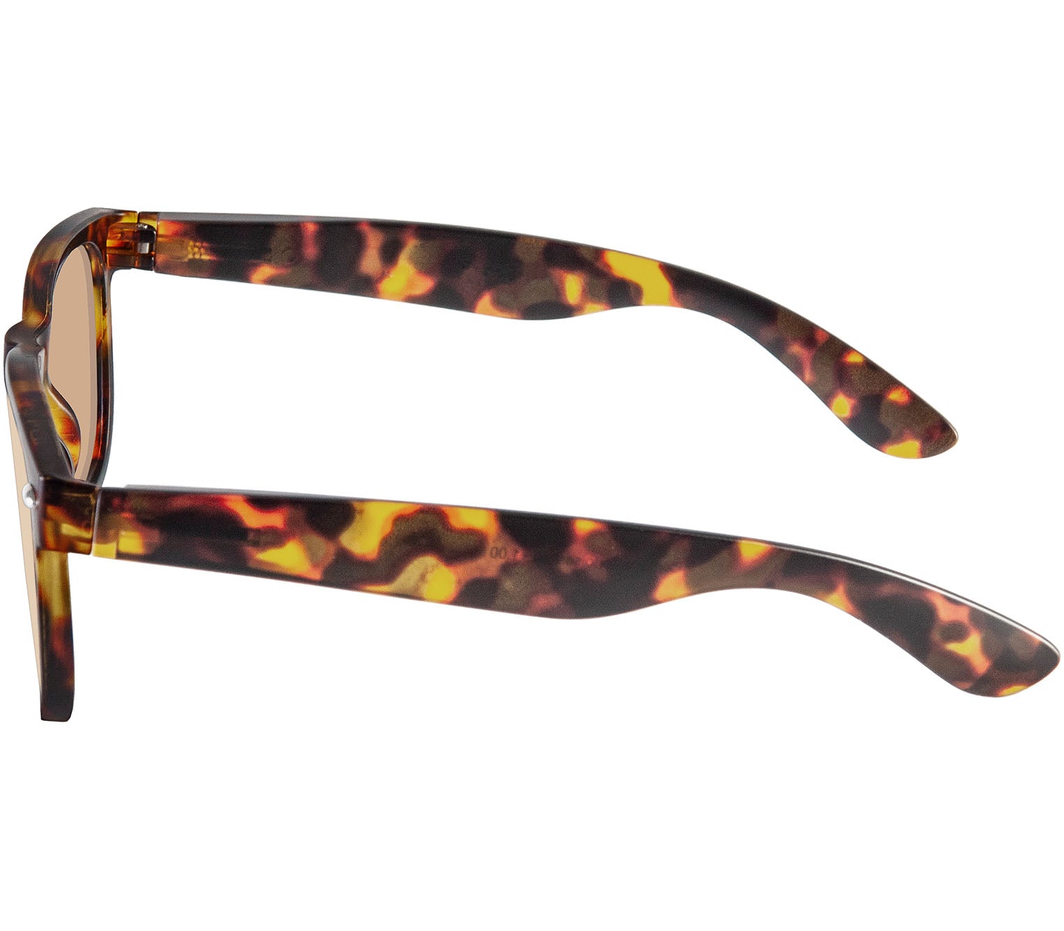 Elegant wayfarer reading sunglasses in deep tortoiseshell with a matt finish. The large oval, brown tinted lenses provide category 3 UV400 sun protection, suitable for strong sunlight. These glasses feature smart rivet detailing as well as spring hinges for added fit and comfort. A matching patterned soft pouch is also included.