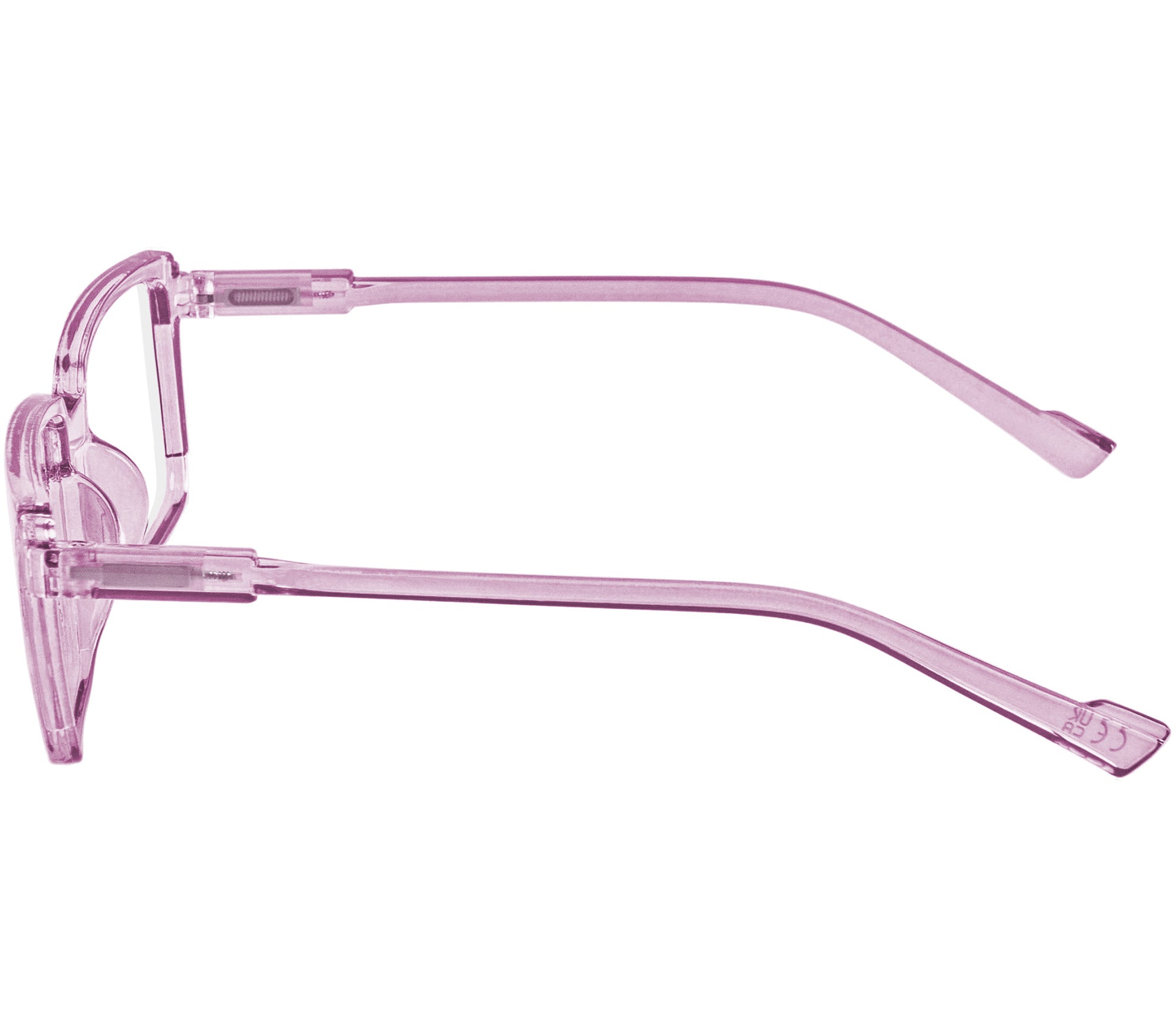 Women's reading glasses in a defining retro style. Featuring an elegant slender frame, almost-square lenses and translucent purple design. These readers have spring hinges for extra fit and comfort, a glossy finish and come supplied with a matching soft grey felt pouch.