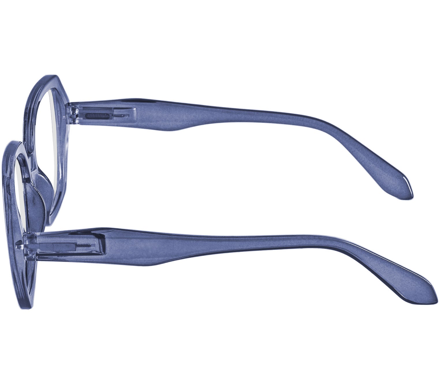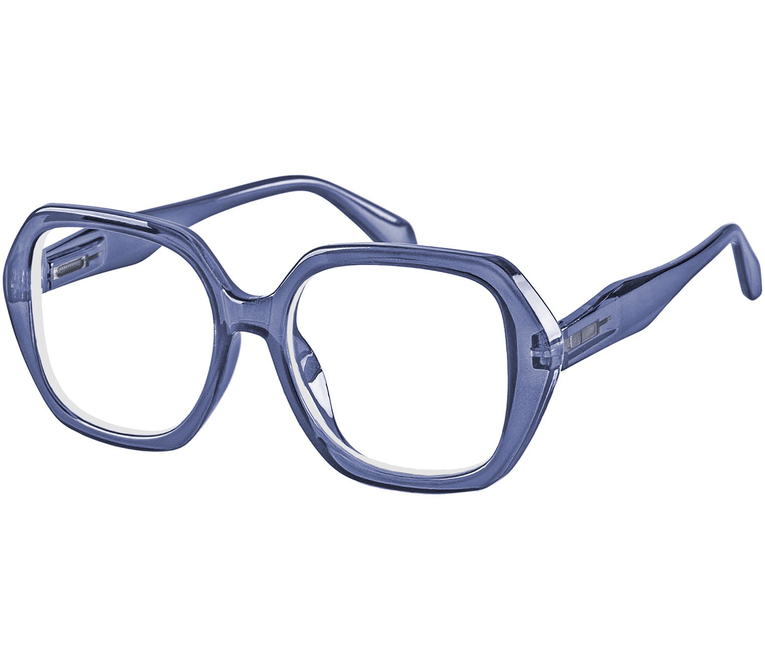 Super retro reading glasses with a large chunky frame and squared lenses in a translucent blue glossy finish. Featuring spring hinges for added fit and comfort and produced with recycled plastic, these readers are also supplied with a smart matching grey felt pouch included.