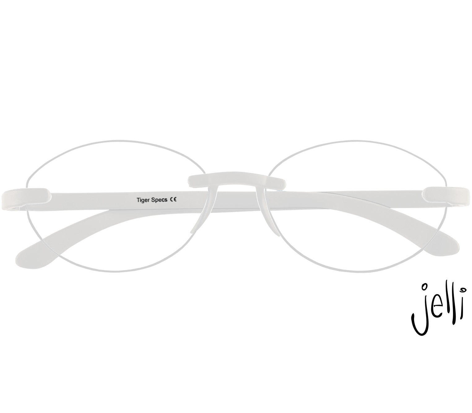 Exclusive to Tiger Specs, these unisex Jelli reading glasses are made entirely from polycarbonate so are both lightweight and durable. The oval lenses are extra thin and light and the rimless frame finished in a distinctively smart glossy white. A matching patterned soft pouch is also included.