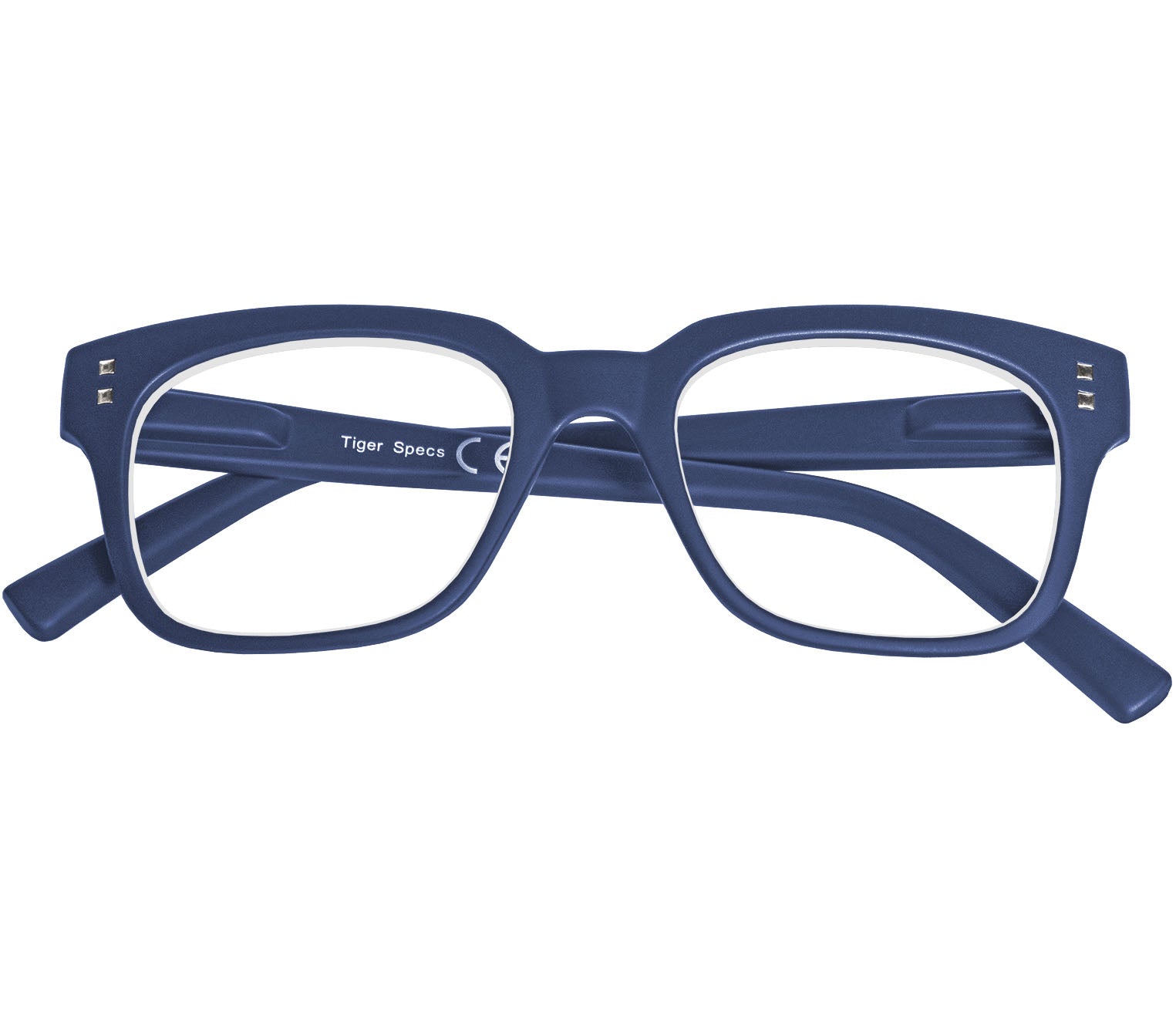 The navy blue frame features a slender, retro-inspired silhouette, matt finish and smart dual rivet detailing.