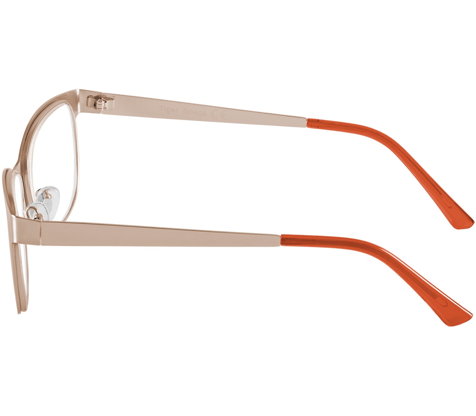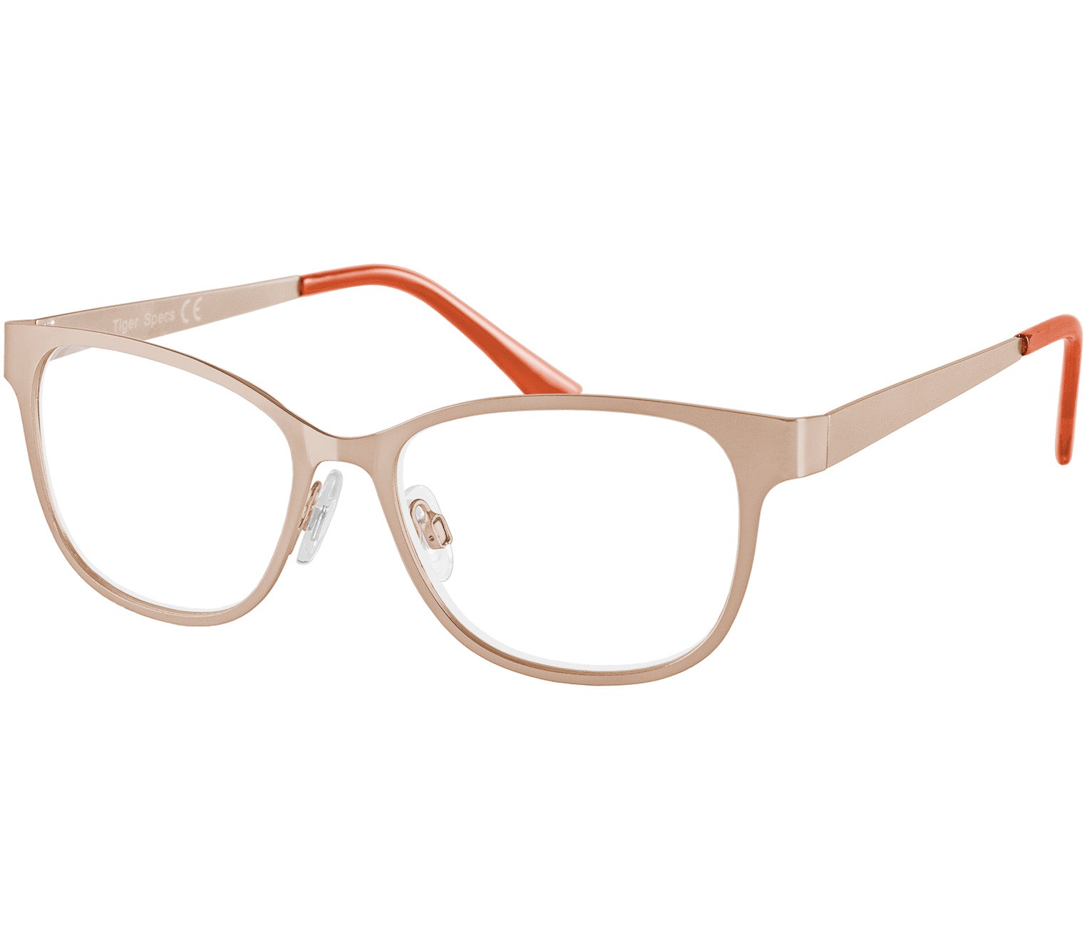 With a soft champagne-coloured metal frame, translucent orange temple tips and a polished finish, these women's reading glasses offer a fresh take on a classic cat eye shape.