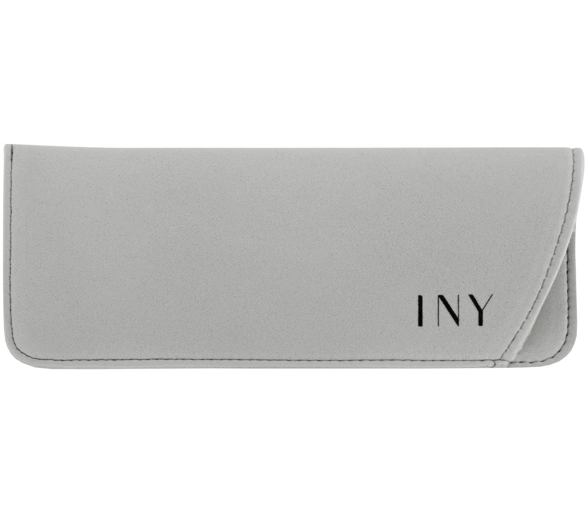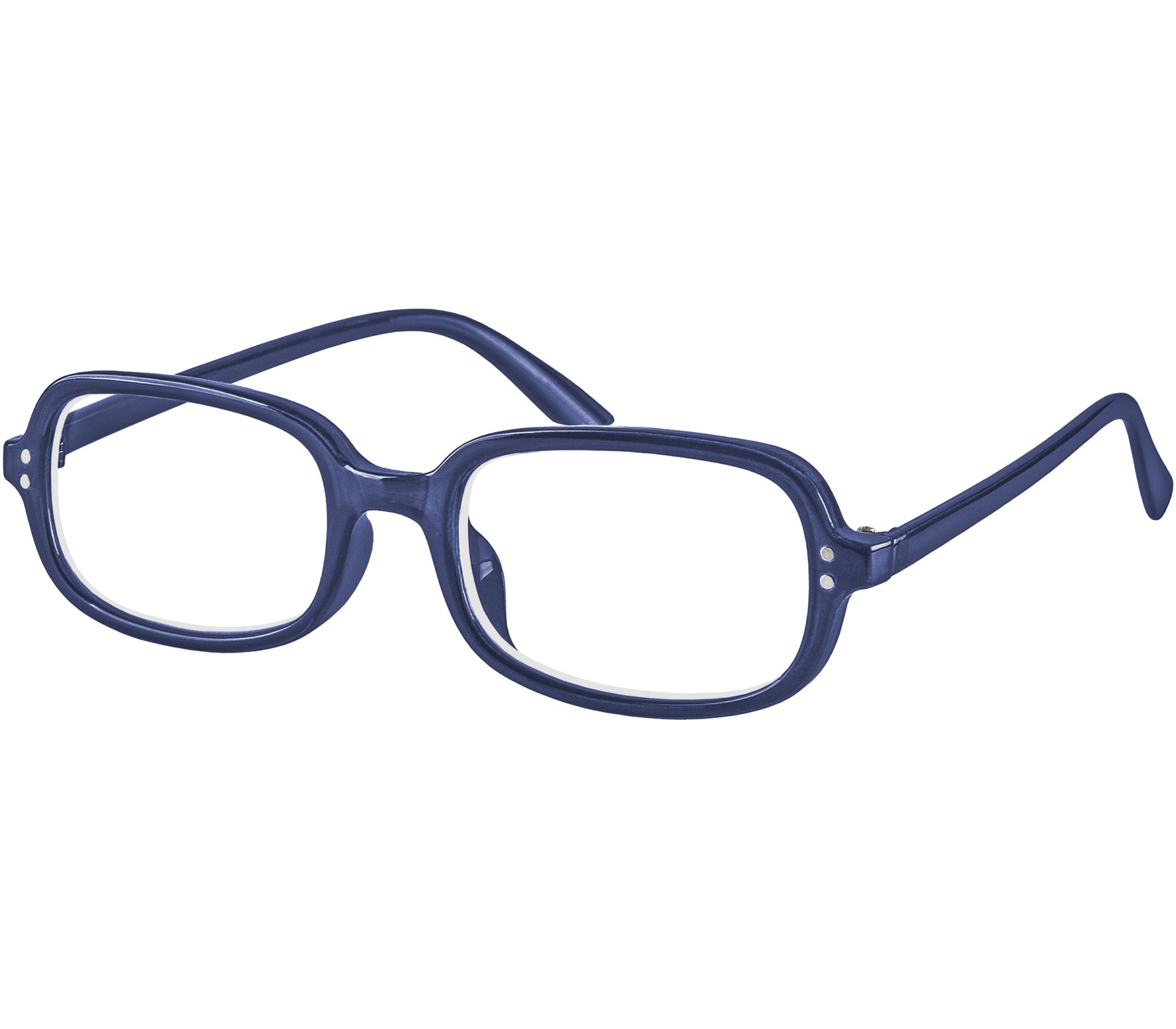 Smart retro reading glasses with a slim oval frame in translucent dark blue and a glossy finish. Produced with recycled plastic, these readers also feature dual rivet detailing and are supplied with a matching grey soft pouch.