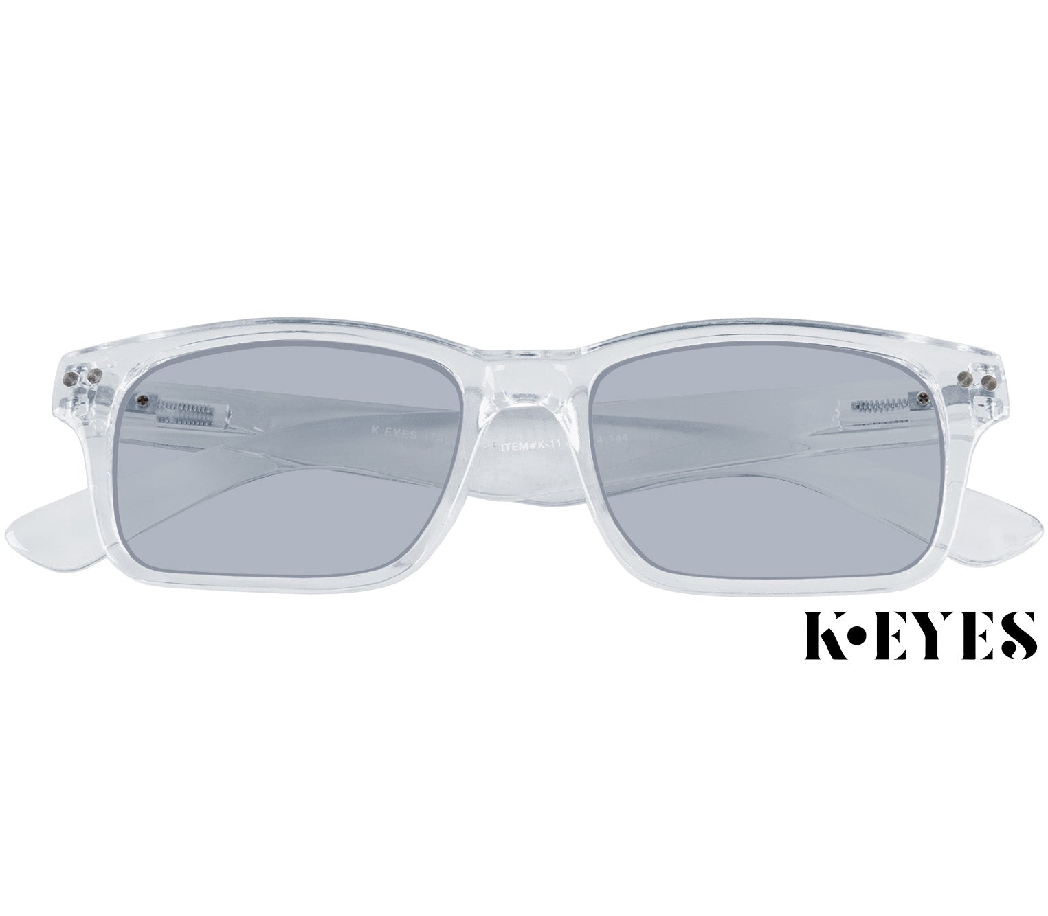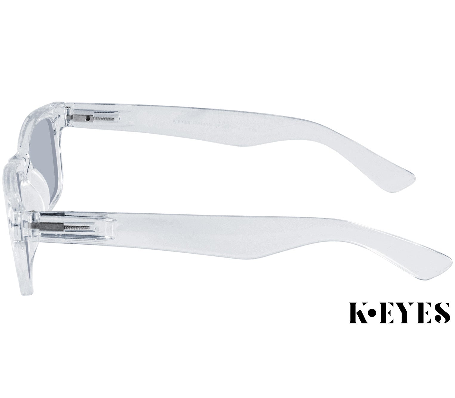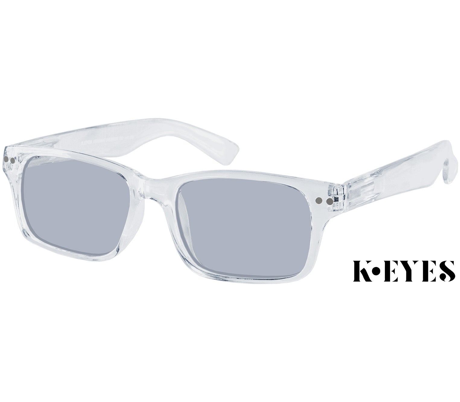 Sleek and modern reading sunglasses from respected French designer brand K-Eyes. Featuring a smart classic frame design with a glossy transparent finish and rivet detailing. The square shaped lenses with grey tint provide full UV400, category 2 sun protection suitable for medium sunlight. The lenses are also scratch resistant and these sun readers come supplied with a matching grey zipper pouch for protection and safe keeping.